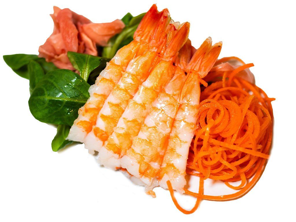 Surové plátky kreviet položené na zázvore a zelenine podávané s wasabi a sójovou omáčkou.