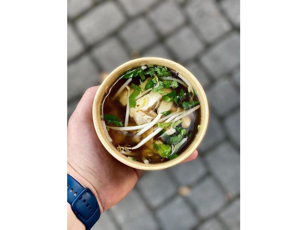 Silná zázvorová polievka, citronovou trávou, limetové listy, zázvor, čilli, rezance, koriander, cibuľa,mungo klíčky, kuracie mäso